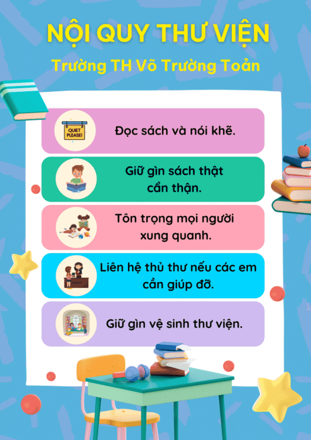 Trong thư viện của trường Tiểu học, mỗi học sinh đều phải giữ cho không gian yên tĩnh, tôn trọng sách và mọi người xung quanh. Việc trả sách đúng hạn và tình thần tự học là vô cùng quan trọng. Các em học sinh sẽ được hòa mình vào thế giới của tri thức, nơi nảy mình giữa những trang sách màu hồng và xanh, mang theo mùi của giấy in và cây viết mới mỗi khi bước chân vào.